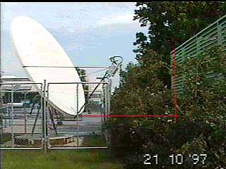 The red line shows how the elevation of the wooden shade has been measured, considering that the azimuth was full East. If the real azimuth had been used, the horizontal distance between the base of the dish and the shade would have increased, so the elevation would have dimisished. This leads me to say that the wooden shade is not interfeering with the uplink signal.